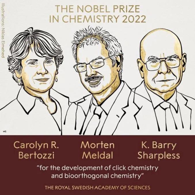2022 年 10 月 5 日北京時間 17 時 45 分許,2022 年諾貝爾化學(xué)獎授予美國學(xué)者卡羅琳 · R. 貝爾托西,丹麥學(xué)者莫滕·梅爾達(dá)爾,美國學(xué)者K. 巴里·沙普利斯,以表彰他們 “對點擊化學(xué)和生物正交化學(xué)的發(fā)展” 的貢獻(xiàn)。