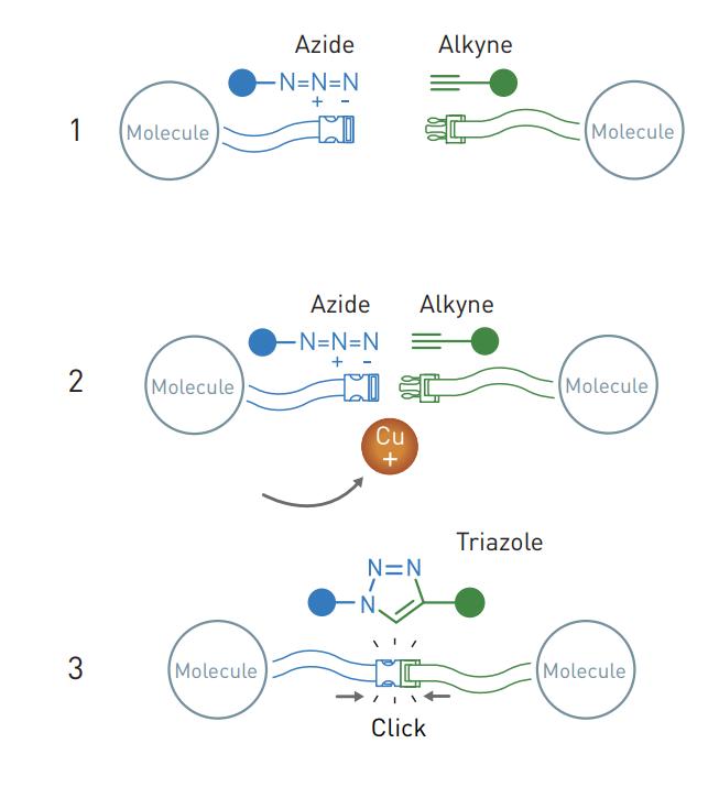 當(dāng)銅離子加入后,疊氮化物和炔烴的反應(yīng)變得極為高效。這種反應(yīng)現(xiàn)在被廣泛應(yīng)用,來以簡單的方式將分子連接在一起。